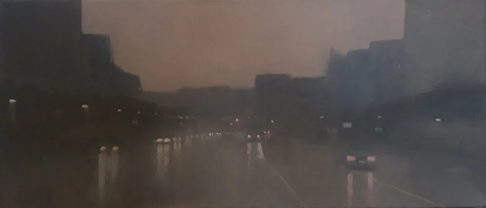 En boulevard med biler, på det der kunne være en hvilken som helst regnfuld dag, er malet med en skønhed, som sætter vores sanseapparat i svingninger. Spejlingen i den regnvåde asfalt er en fornemmelse, og også et sted at se sig selv i byen, eller kigge ind i selve maleriets refleksion.